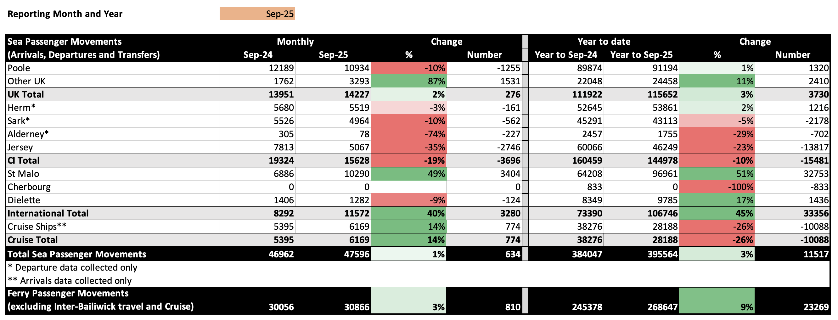 Inter-island travel remains below previous levels, primarily due to reduced passenger numbers on the Guernsey–Jersey route. However, this situation has improved over the year, thanks to the introduction of the Islands Unlimited service. In May, the route was down 25% year-on-year compared to 2024, but this has now recovered to just -10%. Islands Unlimited has already published its 2026 schedule, starting in March, and we anticipate this will drive further growth in passenger numbers throughout 2026.
